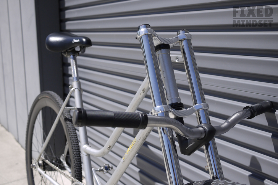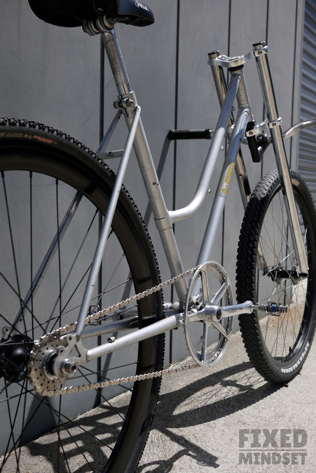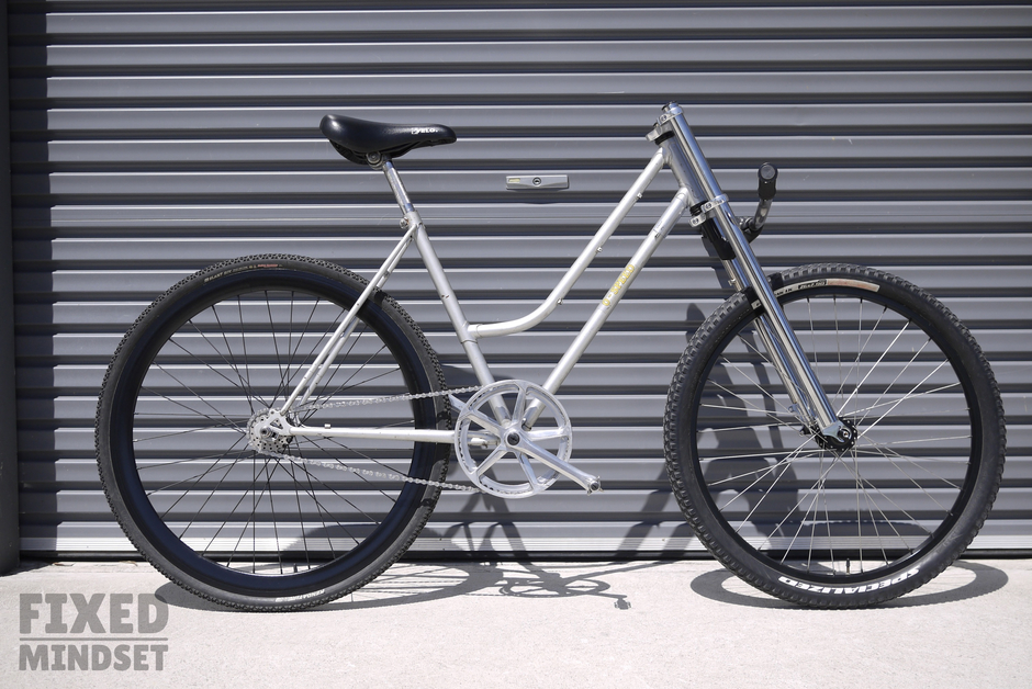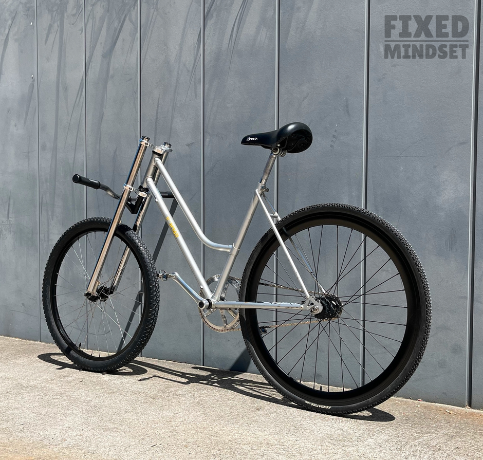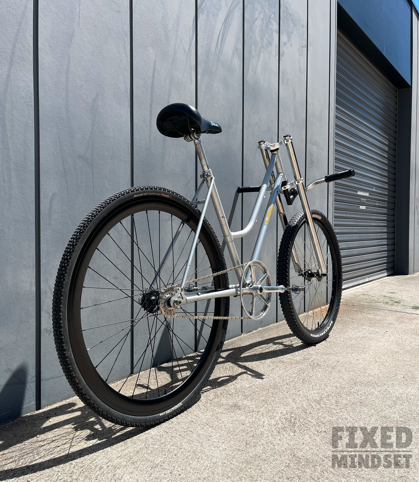 The evil twin of the Dirt Pursuit. This was a donor frame I had listed, until one very rainy day when I realised how nice the Sugino No.6 crankset is, with its 52T chainring. Then came the idea of marrying the frame with a triple tree fork and it all escalated, again. It's another mullet build with a 26x2" Specialized front and 700x32c Slant Six gravel rear - on a deep V street rim of course. The headset, fork clamps and quill stem are all upside down because, you know, Southern Hemisphere Just like the Dirt Pursuit, this bike is fully rideable, if not ergonomic Enjoy #fixedmindset #frankenbiking #madeinmelbourne --- First look video: https://www.youtube.com/watch?v=aikIQea2i1s