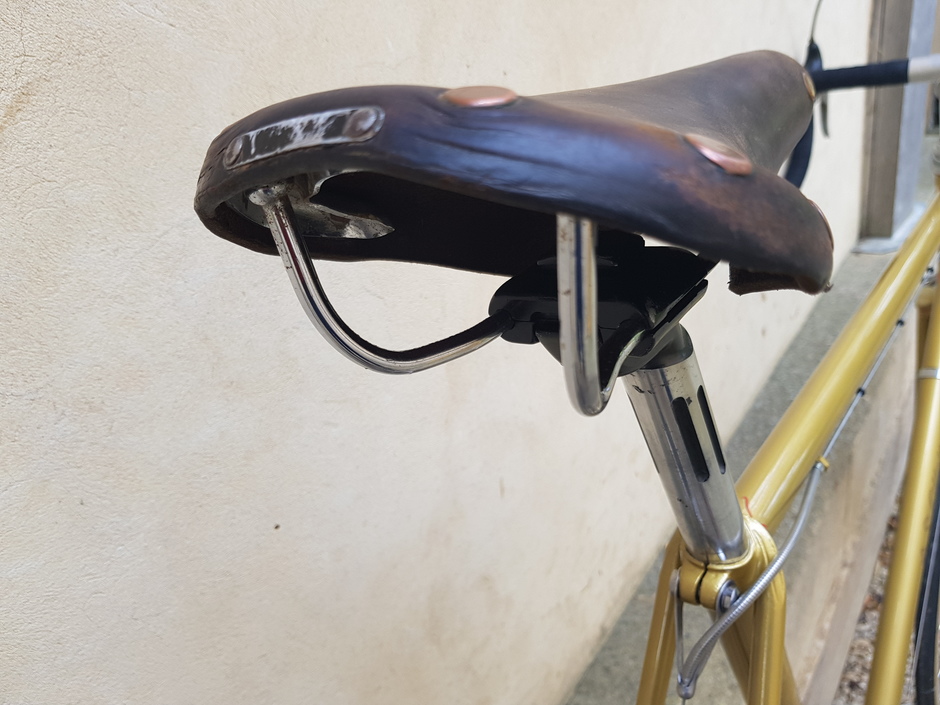 Brooks suede saddle and later Kalloy seat post. Not sure what the post should be but I don't want a steel tube and bracket setup