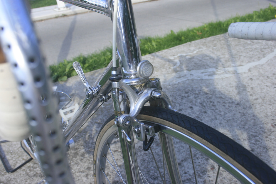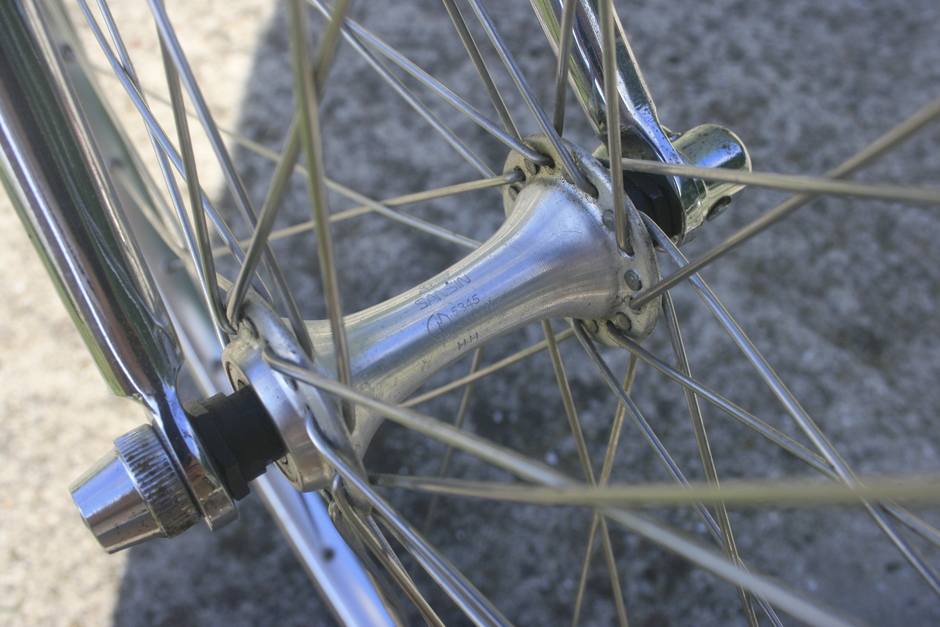 Full chrome Kessels - Van Eenooghe, made by the legendary framebuilder Van Eenooghe, who would also make some frames for Eddy Merckx. You know, like Ugo De Rosa did. I still have the original tubular Mavic GP4 wheels, but put some chrome finish Mavic clincher rims for the occasional leasure ride and everyday display. Bling bling.