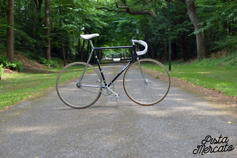 A couple of weeks ago i found a couple of trackbikes which came from a old velodrome. Including was this Francesco Moser trackbike. It's a rare and superb De Rosa build frame. This frame is made out of Columbus SL and SP tubing. If you would wonder why the mix of Columbus Sl and SP tubing, For sizes smaller than 58, only SL tubing was used, but for the bigger frames, SL just isn't stiff enough, so they made a mix with the SP tubing, thus creating a 27.0 mm seat post diameter. I think this bike dates back to 1978-1979 and is in fantastic condition, with the original paintwork and decals. . Francesco Moser, one of the most winning riders ever, who chose De Rosa frames in his professional career, both with Benotto and F. Moser branded bikes, and when he started producing his own bikes. In fact, around 1977, De Rosa helped him to transform the small workshop of his brother Aldo into a high end frame manufacture and trained other frame builders. The early framsets can be identified by a heart shaped cutout on the bottom bracket shell and brake bridge. . Ugo De Rosa was born on the 27th of January 1934 in Milan, Italy. He attended primary school, middle school and a technical school where he followed a mechanical and engineering curriculum. He developed a passion for bicycle racing as a young boy, a passion which remains with him to this day. It first led him to take up the sport of racing in which he advanced through several ranks at the amateur level. But he also became very interested the science of the bicycle itself, and this proved to be the area where DeRosa would make his mark on the cycling world. His first job was in the work shop of an uncle where he repaired and assembled bicycles. In the early fifties Ugo De Rosa opened his first shop and dedicated himself to the manufacture of racing bicycles. He understood what it took to build a true racing bicycle and his reputation began to spread among the amateur racers in Milan. By 1958 the word of De Rosa's frames had reached the professional peleton. While attending a race at the Vigorelli velodrome in Milan. De Rosa was approached by a famous cyclist of the day, Raphael Geminiani. He asked; De Rosa to build him a bike for the upcoming Giro d'Italia. De Rosa responded immediately to Geminiani's request, for he knew that making this champion's bikes would certify his craftsmanship and launch him into the world of professional cycling. The sixties saw De Rosa bikes become a fixture in the professional peleton. The powerful Faema squad was the first team to ride De Rosas to the forefront with great champions like Soler and Suarez of Spain. Along with Belgian Rik van Looy they won a majority of the races they entered. Other De Rosa teams of the decade included Tbac (1964) and Max Majer (1967). . In 1969 De Rosa was approached by Gianni Motta, a great champion of that era who had admired the bicycles of the Max Majer team. Motta wanted to engage De Rosa as his frame builder and mechanic, De Rosa accepted and became the bicycle supplier to Motta's powerful Sanson team as well. It was also during this period that one of the greatest stars of cycling was rising - Eddy Merckx. DeRosa built some frames for Merckx around this time, but it was not until 1973 that their now famous relationship was formalized. That was when Eddy asked Ugo to become the official frame builder and mechanic for the Molteni team which he captained. The results were unprecedented as Merckx and his teammates won nearly all the major races including the Tour de France, the Giro d'Italia, Milano-San Remo and the World Championship. This partnership remained in effect until Merckx's retirement in 1978. In 1981 Eddy again called upon his former frame builder to be a technical consultant when he first set up his own bicycle manufacturing facility. De Rosa's talents were, however, in great demand by the mid- seventies. In 1974 another great racer came to him in search of the frame that was the talk of the pro peleton. Francesco Moser wanted De Rosa bicycles for his Filotex team. De Rosa complied and the results were rewarding for both parties. The team was taken over by Sanson in 1976, and it added the powerful Belgian Roger DeVlaeminck to its roster while Moser went on to win the World Championship. . Courtesy of this info can be found on: http://www.classicrendezvous.com/Italy/De-Rosa/derosa_history.htm . . I found the frameset with the original Campagnolo pista bottom bracket and headset. Added further Campagnolo pista wheelset,crankset,pedals. A classic Cinelli pista cockpit to finish this gem. . 59cm center center 60,5cm center top 58,5cm top tube