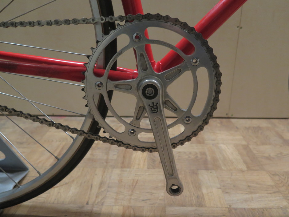 Belgian diamant track from the early 80's made by Eddy "Martelly" Martens a Belgian frame builder with a amazing history. Building frames is a profession in its own right and many bike brands ventured and therefore not to venture there. They buy their frames by others. For example, by Martelly. History of Martelly : Spoken by "Eddy Martens " My grandfather Arthur Martens was in fact the starter with framebuilding, he was also a very good rider in the period before the first world war with good results in the classics. His best result was fifth in tour of Flanders by 23-05-1913. He later changed his name Arthur Maertens in Arthur Martens. He has made frames for professional riders of team Poeders Man, for, among others, Daniel van Ryckeghem and Willy Vanneste. Also many riders of the Flandria team had their frames build by my father, but frames were not painted, these were then secretly issued by the riders tand given to the painters working at the Flandria factory in Zedelgem. To spray in the same colours as the team colours. In 1980 I took over the shop from my father and i created the name " Martelly " and also I decided just to concentrate on construction of race frames. We worked with the tubes of Reynolds, Columbus, Vitus and Ishiwata. We have build over 25000 frames in 20 years time period for various companies in Belgium and the Netherlands. I have made frames for Cornelo in the 70's and 80's, also for Empella and Wout Verhoeven and Jan Janssen. Also for Henk van der Kloof from Remy (with R-pantograph). With U-Pantograph in the forkcrown and bottom headtube lug ,this was for the Union-factory. I made frames the brands : Diamant, Dossche Sport, Concorde (Astore), Splendor, Chinetti, Devos Sport, Sportivo, Destoop Gent (Coppi frames before 1980), Flanders, U.Scanini. . And for the teams Histor, Splendor, Safir, Empella cyclocrossteams met o.a Simunek, Flanders, Boston, Carlos, Gregoire. . . Courtesy for this info : http://www.klassiekeracefiets.info/2013/01/04/martelly/ . . . 51cc 52,5ct 54tt