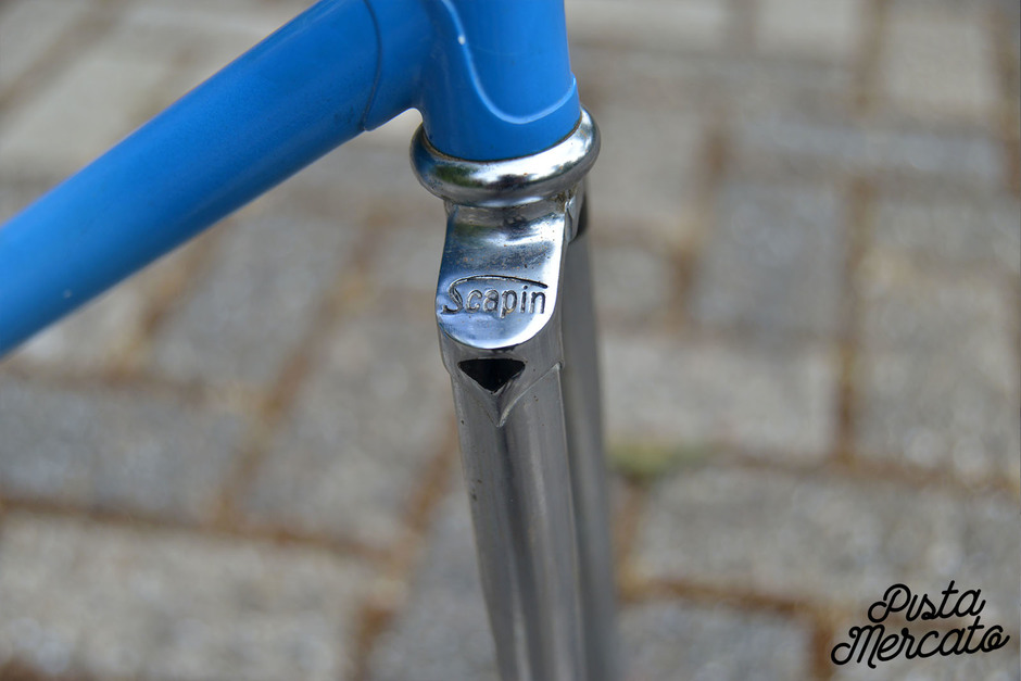 Umberto Scapin founded his eponymous brand in 1957, following a highly respectable career as a professional cyclist. From the very beginning, it was his intention to make incredibly unique bicycles, made by hand and finished with a fastidious attention to detail. . Early models from Umberto’s workshop are rare and unusual. Cromovelato paintwork was occasionally used, lugs were highly refined and some models included superb pantographs. Not one, however, was the same. Some were even gold plated, and as far as bicycles are concerned, Scapin created the most precious frames in history. . In a cotemporary context, Scapin is regarded as potentially the most prestigious and flamboyant brand in the Italian bike industry. Both in production and design, Scapin bikes are the choice of only the most obsessive connoisseurs. Nothing has been lost from Umberto’s philosophy; quality, detail and individuality are the cornerstones of modern Scapin bicycles. Craftsmanship, despite modern production methods, remains at the forefront of Scapin products, which are still made in Italy to this day. I dont think there are allot of trackframes made by Umberto Scapin. . Frameset was used in the velodrome as a trainingsframe, hence the respray. I will try to see if i can see any reminisce of the original paintjob. . 58cm center center 59cm center top 58cm top tube