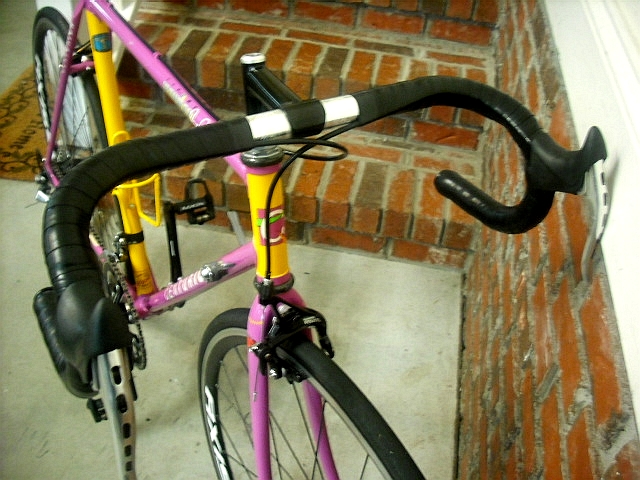 Dura Ace 7403 8-sp RD, Shimano 1050 7-sp FD on a Cutter carbon strap adapter, Dura Ace 7403 8-sp downtube shifters.