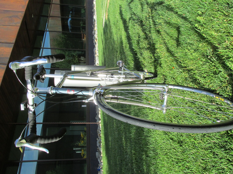 I love vintage steel frames, I found this 1987 frame in near mint condition and fitted it with vintage Dura ace group. It is a very comfortable and stable ride. Originally this bike was set up with Shimano 600 components including down tube shifters. The size of the frame would make this a long and dangerous reach so I decided to upgrade to a more modern Dura Ace group with brifters.