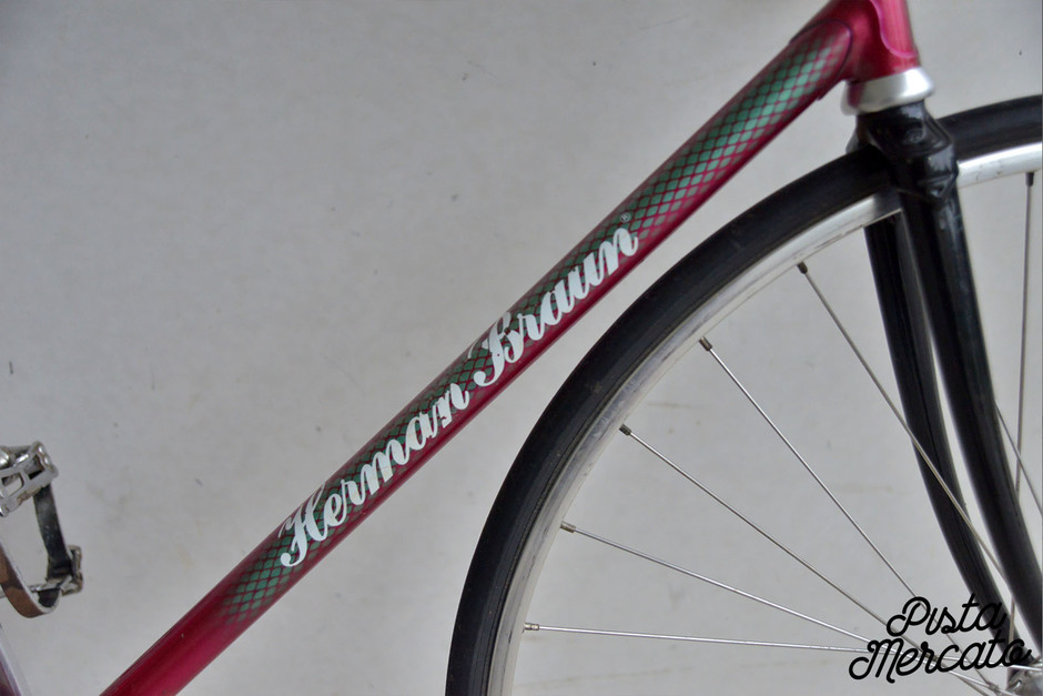 Picked up this very nice Herman Braun trackbike. I was in contact with the seller for a while and made him a offer as i really wanted to have this in my collection. After a while i recieved a message from the seller that he agreed on my offer. Thanks again Sil i am very happy with this one. Sil also gave me the original specifications that Herman used for the person which he build this frame for in 1987. Frame has the original paint and decals. Check out the tight geometry of this frameset and a nice detail on the seattube with the crimp. Unfortunately the fork has been repainted at a certain stage. The frame also came with a mix of Campagnolo Nuovo Record and C record parts. I made contact with Herman Braun to ask if he could remember if the fork was chrome or maybe painted in the same paintjob and the frame. Herman told me that most probally the fork was chrome. This means that i will rechrome the fork in the future. And that the frameset is made from Reynolds 531 competiotion tubing. Herman also told me that the Campagnolo C record groupset was original when he build the frame. So i will switch out the Campagnolo Nuovo Record parts for C record parts. Herman Braun started his business in 1983. . Herman built his own bicycles since 1983 under the brand name Herman BRAUN, formerly located at the Elementenweg in Spijkenisse, Holland. Herman is very well introduced in the cycling world. As an aspirant he started at PRC Delta in 1969, then he cycled to 1972 as a novice. In 1972, as a 16-year-old, he started as a mechanic for the famous cycling team of Kees Pellers in the tour of Spain. He was also involved in the military cycling team for 3 years, culminating in the world championships in Italy. In 1977, Herman moved to the Gazelle cycling team, which drove upcoming talents such as Jean Paul van Poppel and Eric Breukink. At the end of 1985, Herman stopped as a mechanic to be able to focus entirely on his own company and to continue growing. From 18 September 2010, Braun Cycling is based at the Theemsweg 13 in Spijkenisse, Holland.. In the state-of-the-art workshop Herman has received an excellent partner in his son Dave. Dave is developing rapidly as a very skilled frame builder. The passion and inspiration of son Dave continually invests in new machines to design and build high-tech bicycle frames. Now, however, an even lighter and stronger material especially lightweight steel and titanium. Meanwhile they have the most modern frame construction factory in the Netherlands. Where competition is now building everything in low-wage countries, they adhere to the Dutch artisanal quality, service and guarantee. As a result, everything is handmade and the wishes of the customer are central. Together they form a close team that has returned many cyclists to the cycling pleasure. The pleasure that Herman and Dave radiate when building frames is reflected in the top quality of their products. 60cm center center 61cm center top 58cm top tube