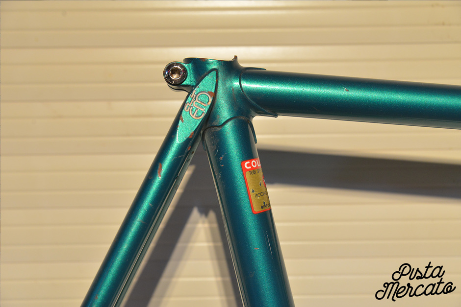 Eddy Merckx trackframe used by team Winora from Germany. The cyclist Engelbert Wiener founded E. Wiener GmbH in 1914 in Schweinfurt, where bicycles were produced by individual assembly and also distributed. In 1918 the first bicycle wholesale was built in Schweinfurt and further expanded in the following years. Bernd Seuffert, the grandson of the company founder, took over the company in 1956, which at that time already produced around 6000 bicycles per year. In 1963 the first Winora bicycle factory with conveyor system was built in Schweinfurt. In the early 1980s, a new bicycle factory was built to meet the growing demand, triggered by the oil crisis and new health awareness. In 1988, Winora took over the company Staiger (Stuttgart) and founded Winora-Staiger GmbH. In 1997, the company was connected to Derby Cycle Corporation, Cloppenburg. Susanne Puello, the granddaughter of the founder Engelbert Wiener, took over the management. In 2001, Winora-Staiger GmbH and E. Wiener Bike Parts GmbH & Co. KG joined the Winora group. In 2002 the Winora group was taken over by the Accell group in Heerenveen, the Netherlands. . . . 61 Center center 63 Center top 58 Top tube
