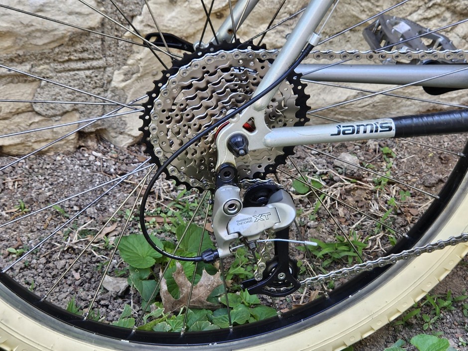 I traded 2 sets of used tires for this Jamis in May 2025. I did my normal "mtb to cafe cruiser" thing, making it more comfortable for my pentagenarian body. I think this is a 1993 model because it had the 7 speed black Deore LX parts, but I can't find enough info online to confirm it.