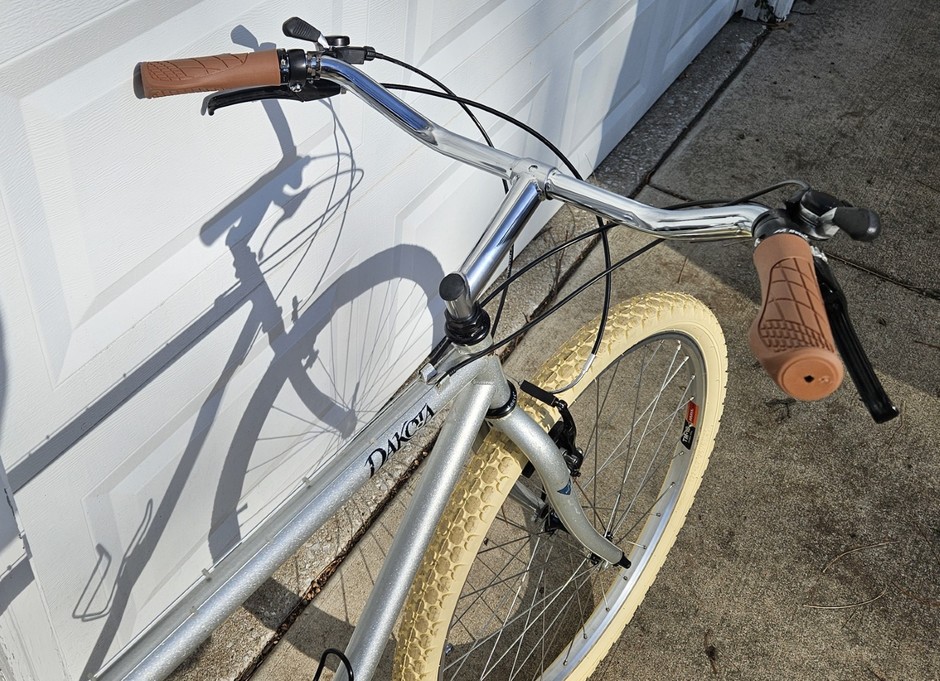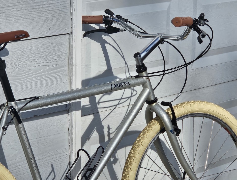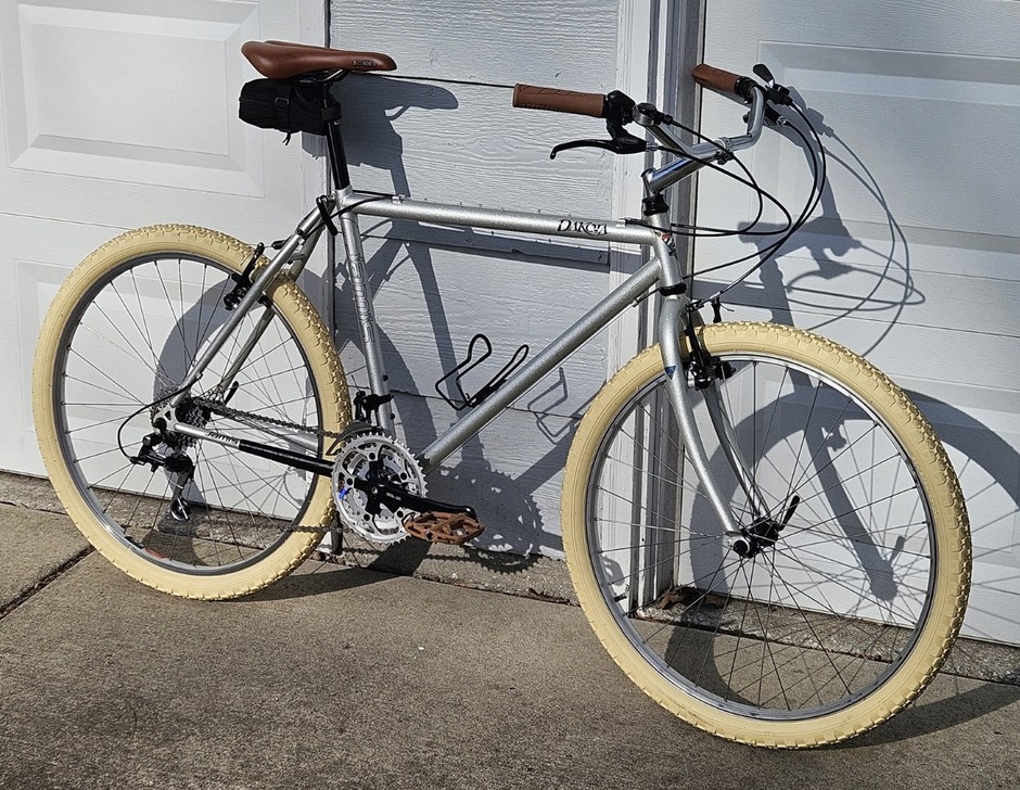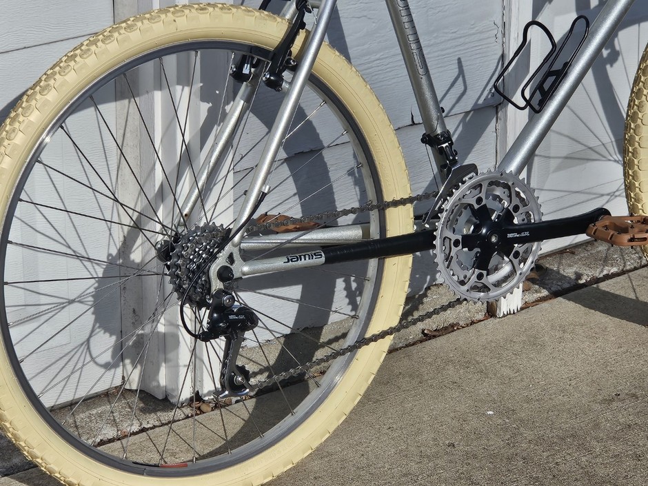 I traded 2 sets of used tires for this Jamis in May 2025. Last photo shows its configuration when I got it. I did my normal "mtb to cafe cruiser" thing, making it more comfortable for my pentagenarian body. I think this is a 1993 model because of the 7 speed black Deore LX parts, but I can't find enough info online to confirm it. UPDATE: In January 2026, I found a small crack at the seatstay/toptube cluster. Crap.
