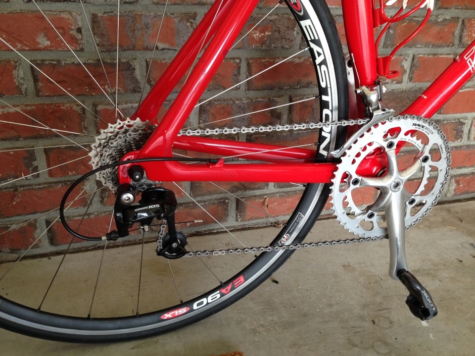 Race Face 53/39, Dura Ace 12-27 cassette (10sp) and Dura Ace 7900 chain with KMC master link.
