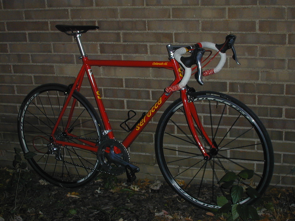 Completed. Likely will be swapping some parts around. Carbon fork at some point. Better photos later, playing around with a 1999 Nikon Coolpix 800