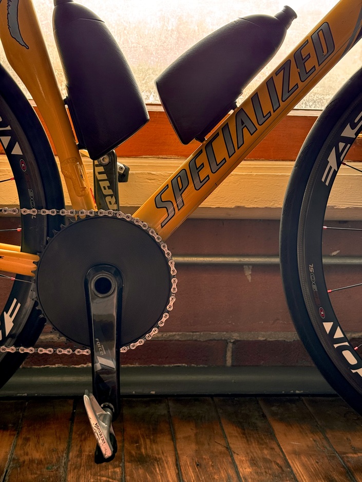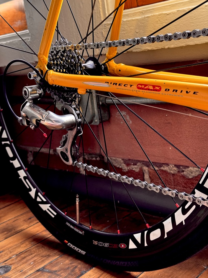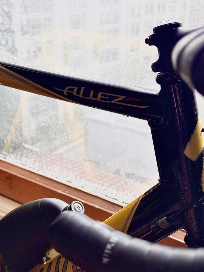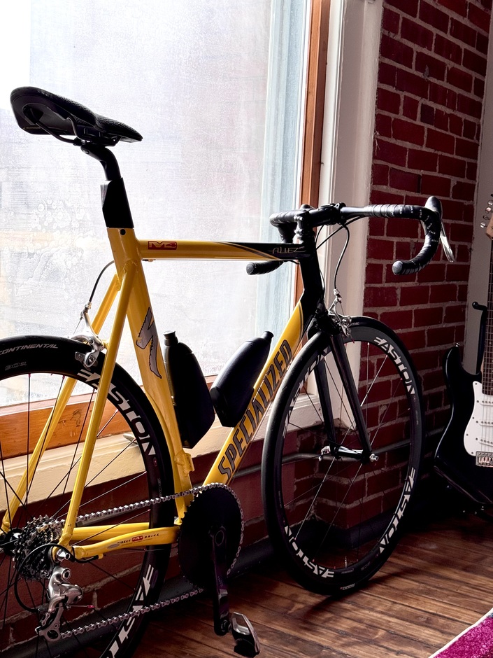 I bought this bike on Marketplace for several reasons. #1 I wanted something dirt cheap and reasonably aero for a triathlon I was competing in. #2 Someone close passed on but, similarly, they raced on a black and gold specialized so this was fitting. I purchased it for $140 with a crushed fork and semi roached groupset. From there, I replaced everything sans the front brake, shifters and rear der.