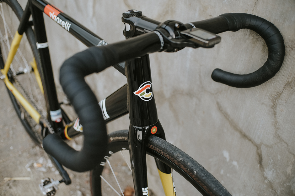 Fabric Knurl bartape, Cadence topcap, Lezyne Strip Drive, Knog Oi bell, Cateye Rapidfire ICS, Protech crank boots, Cateye Micro Wireless.