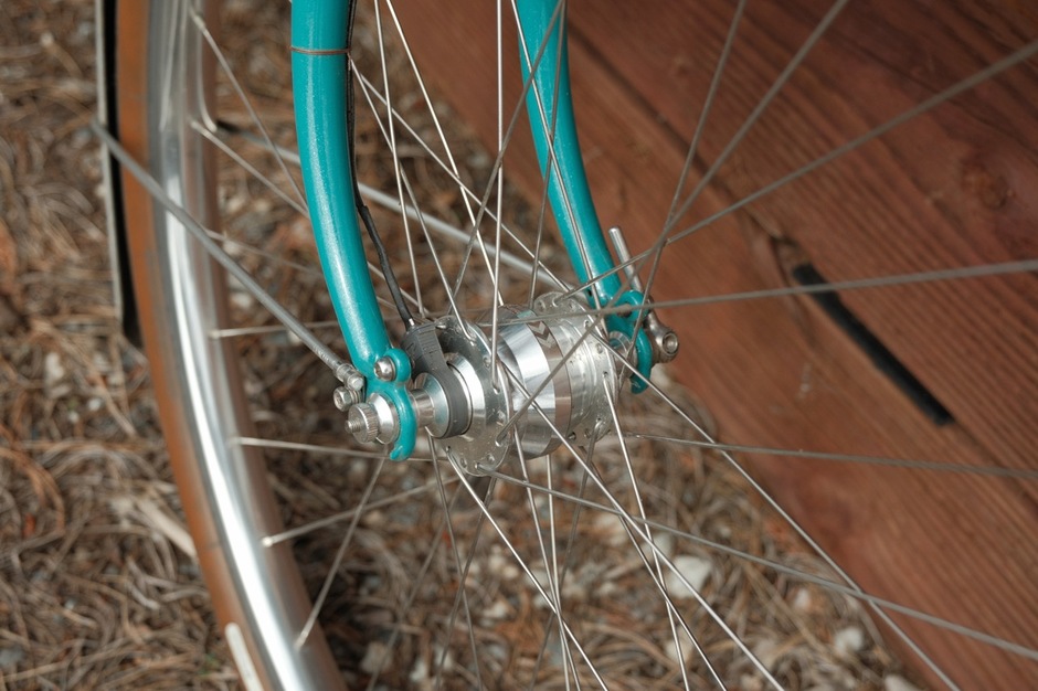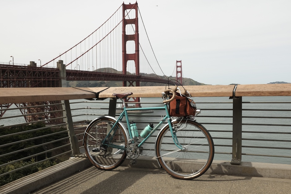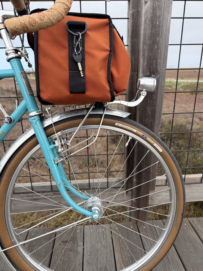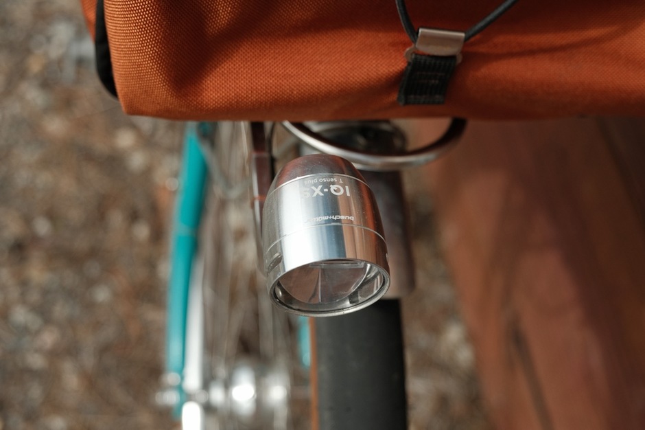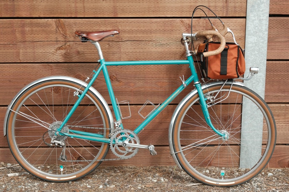 Velo Orange Front Rack with integrated decaleur, Velo Orange Rando Bag, Honjo Smooth 650b 50mm fenders, King Isis Stainless Steel Cages, Busch + Müller IQ-XS Dynamo Light