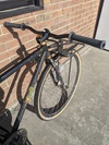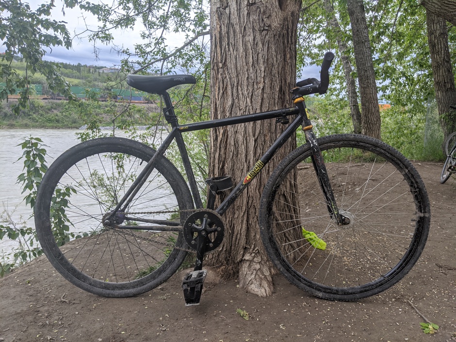 its an Enforcer bike polo frame. i changed the fork out so it could bar spin and rode it as a fixed gear freestyle bike for awhile. Now its my big tire commuter bike. Clearance for 42c tires and a high bottom bracket, its a pretty versatile frame.