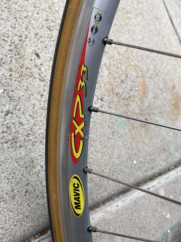 Mavic CXP 33 Clincher rims on Shimano Dura Ace high-flange hubs (36Hole Front is radial laced.