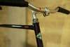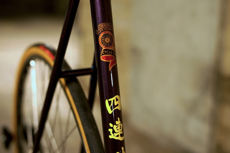 I bought this frameset with 3rensho decals on it but it was obvious that it wasn't an NJS frameset. I media blasted it, filled a few dents and then gave it a new finish. There's a Nissan Skyline purple ground coat, then a custom three-colour flake over the top. The graphics are all airbrushed - no stickers or transfers. I've re-imagined the 3rensho logo to a 4... becuase four is more than three so it must be better right? Instead of the classic Cherubim logo, I've changed the wording. Love the bike... rides like a weapon, has zero clearance on the fork. Super impractical for street riding in the city but I love it.