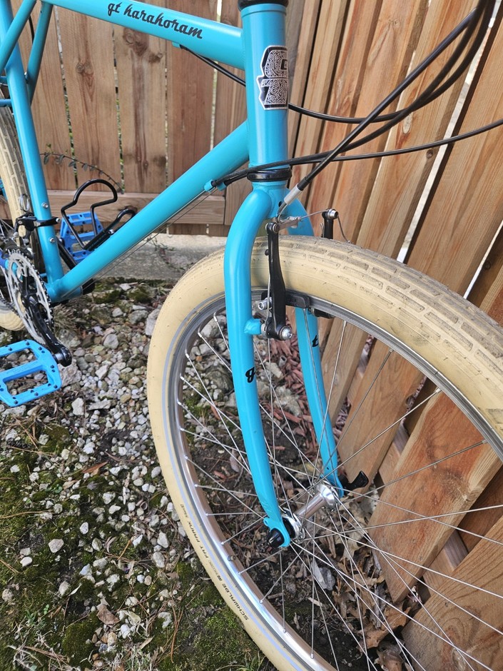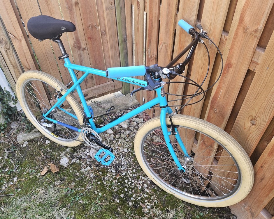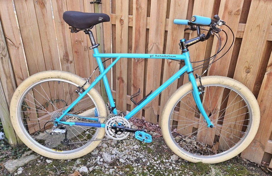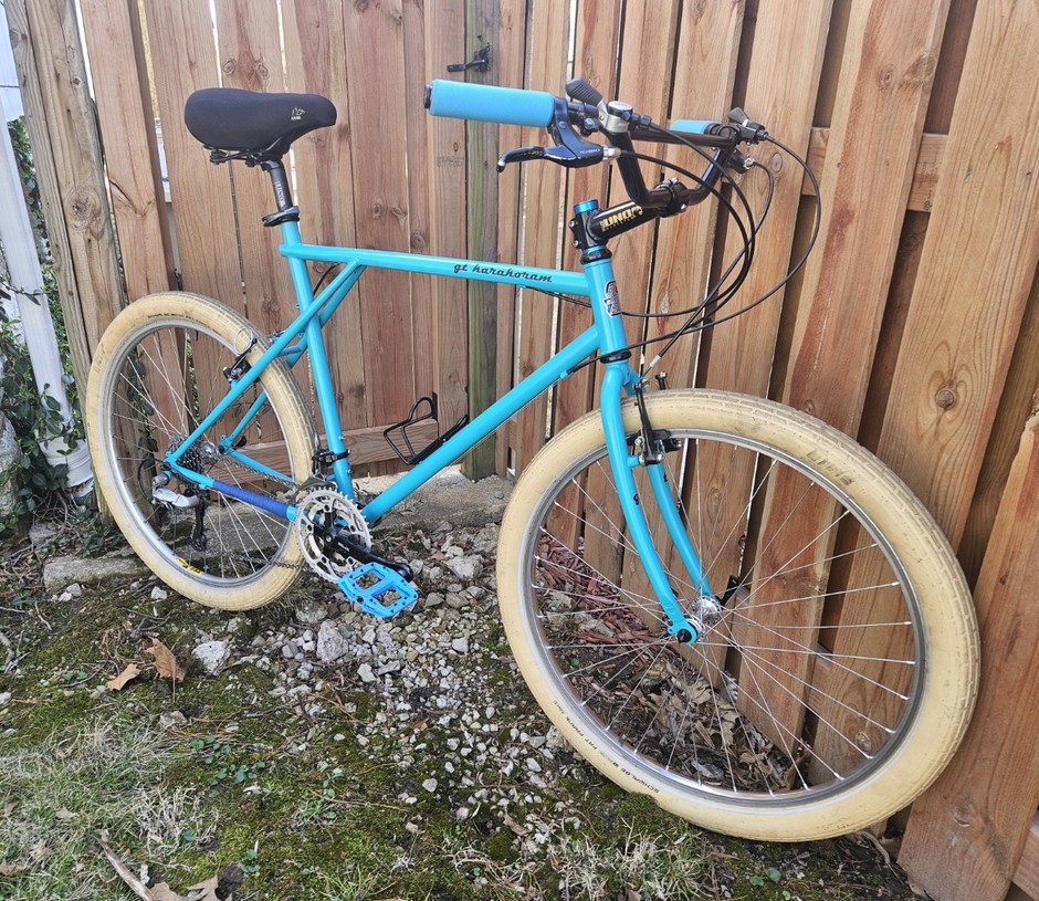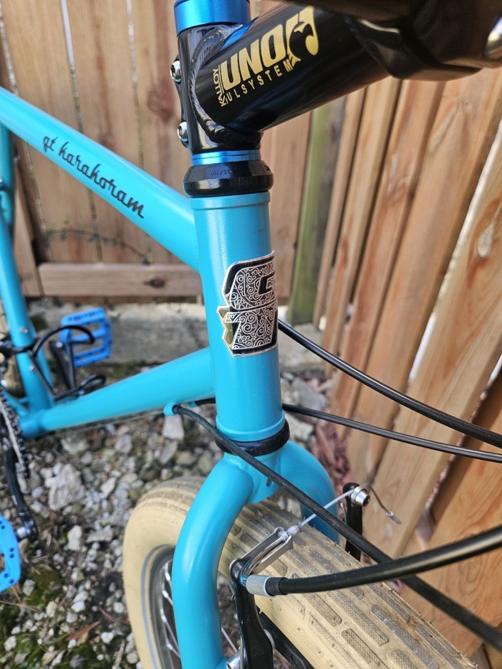 Was originally bright red and full of scratches. I had the frame/fork blasted and then repainted it using turquoise Dupli Color engine block paint; Added a metal GT head badge and a wide sweep handlebar. Great trail bike.