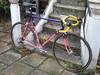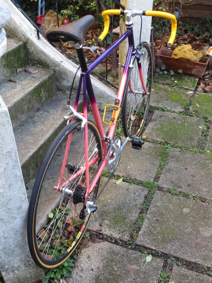 Alain Michel was a very reputed french framebuilder in the 80-90's. Built a lot for clubs and racing team. This frame (probably from 1991) had been painted at the Peugeot racing team colors, but with no decals. I don't know why.