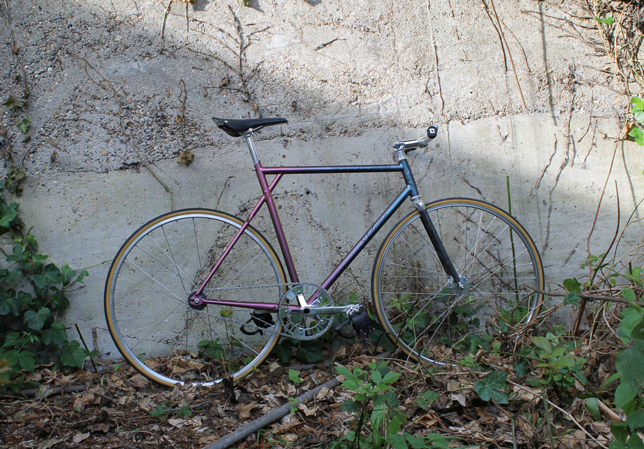 This is a bike I had custom made for me by my good friend Trevor at Autumn Frameworks in London. There are lots of classic track frames that I wanted to own but my budget wouldn't accommodate for so I asked for this... The geo is based on a Cannondale Track, the small triple triangle references the GT and my much loved BMC Track Machine. The paint was originally a garish glitterbomb that nodded towards the NJS flavours I really love but now it's toned down (a little) with the TVR style matte flip paint fade.