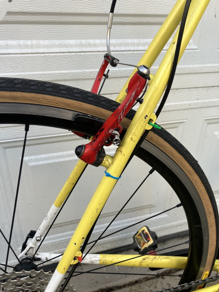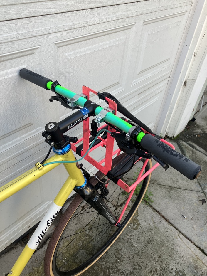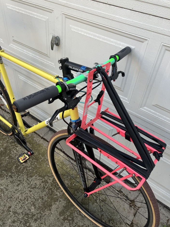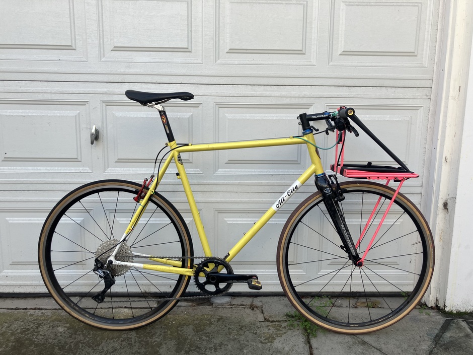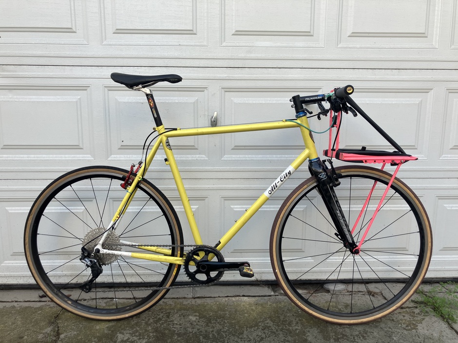 Fellow messenger found this frame lying on the sidewalk and gave it to me for free. All the parts I already had or were also given to me, I spent like $40 on this thing in total. It’s fine, nothing special