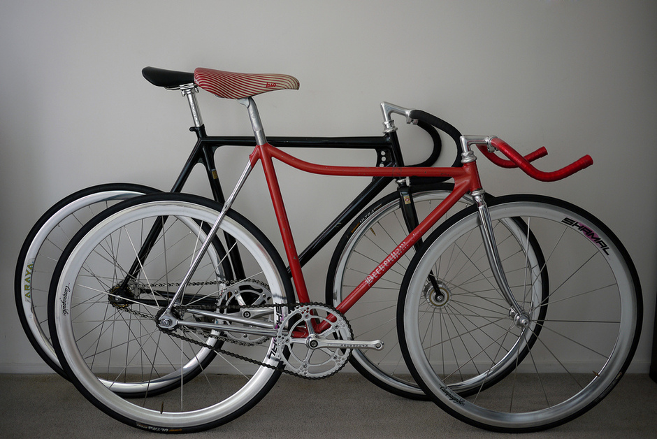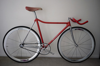 New Zealand made Don Gibbs track but branded for Beckenham cycles in Christchurch. Columbus SL tubing with 700c front and rear. Tiny head tube so it feels just like one of my pursuits when I ride it!