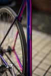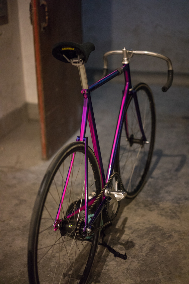 Nagasawa Rear Track Dropouts, ST, DT and TT are all Gilco Tubing with a Gilco Rear monostay made out of a Gilco Chainstay. BB is hand carved with Bishop cutout. Giver a purple Pearl to Hot Pink fade paintjob with all logos in Chameleon Colour Change Paint