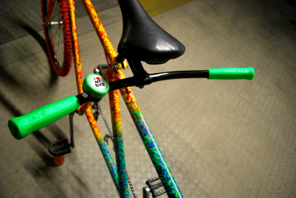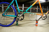 DIY tandem, mostly built from scrap and spare parts. The frame is made of three mtb frames. Only new parts are the tires, grips and the bells. 3.0 gearing for the real mtb-fun ...