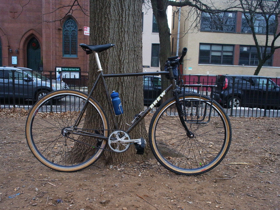 custom Brew frame from a framebuilding class in December 2020. it was my gravel bike for a long time, then I retired it and at some point the yellow powder coat got really fucked up, so I stripped it and applied gun bluing which is the finish you see here (clearly I did not apply enough clear coat but the rust is kinda a vibe imo). originally built it up as a trackpacking rig but then it got really cold so I threw the narrow risers on and it is currently my commuter. it had sliding Paragon drops on it from the beginning, so converting this to fixed was really easy. thankfully I found some sweet 130mm VDS fixed hubs! still not sure whether to keep it like this or throw on some drops and brakes and ride it as a single speed cross whip..