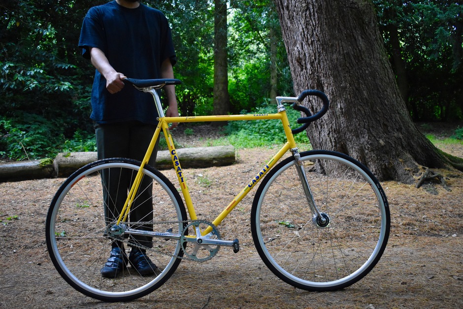 My 58cm Casati Track Monza, in a vibrant yellow. I first had it build up on silver parts, campy headset, dura ace hubs etc. Now i have built it up black/yellow to bring the frame out more. Might change a few more things though.