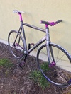 Paul Component Engineering in Chico makes great components, and every now and then they drop a number of their parts in a temporary colorway. About a year ago they released a purple colorway that was reminiscent of a lot of popular bmx models in the 80's. A few months after the Paul drop, Factory Five out of Shanghai released their pista track hunearly a nearly identical purple anodize. I asked a local mechanic (Tyler @ City Bike Works in Sacramento) to build the wheels for me since I just moved and didn't have a shop setup yet... Here's the results with all the purple added to the gray & green frameset.