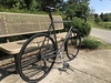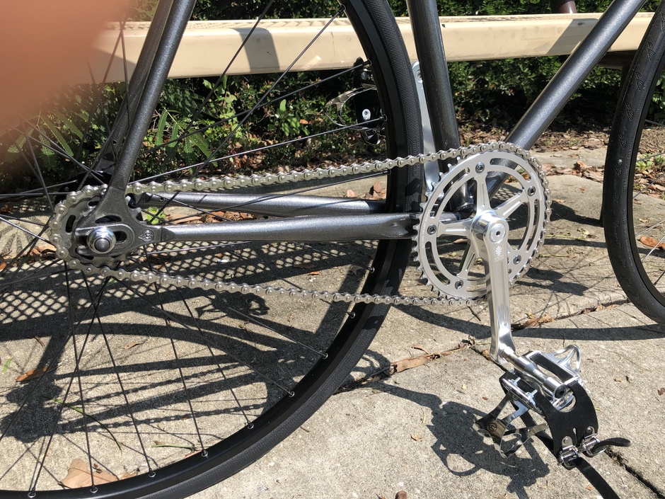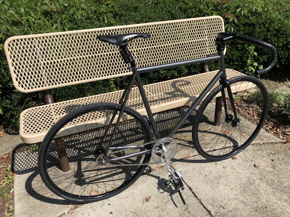 This is the Cinelli Gazzetta Beyond Blues Eyes (2018) frameset, repainted (powder coated) to a gloss gunmetal grey with metal flakes. Ditched the uni- fork that came with frameset in exchange for All City’s Track Fork but also had it repainted to remove the decals.
