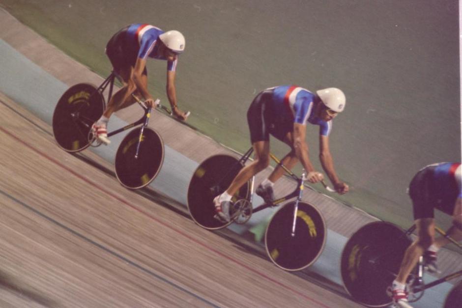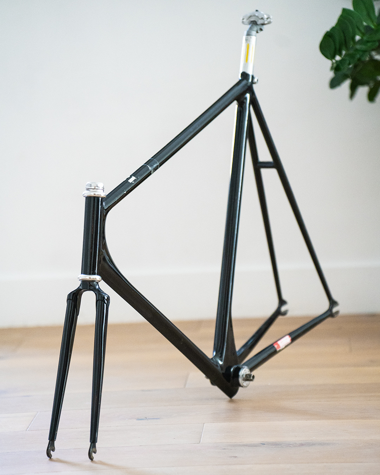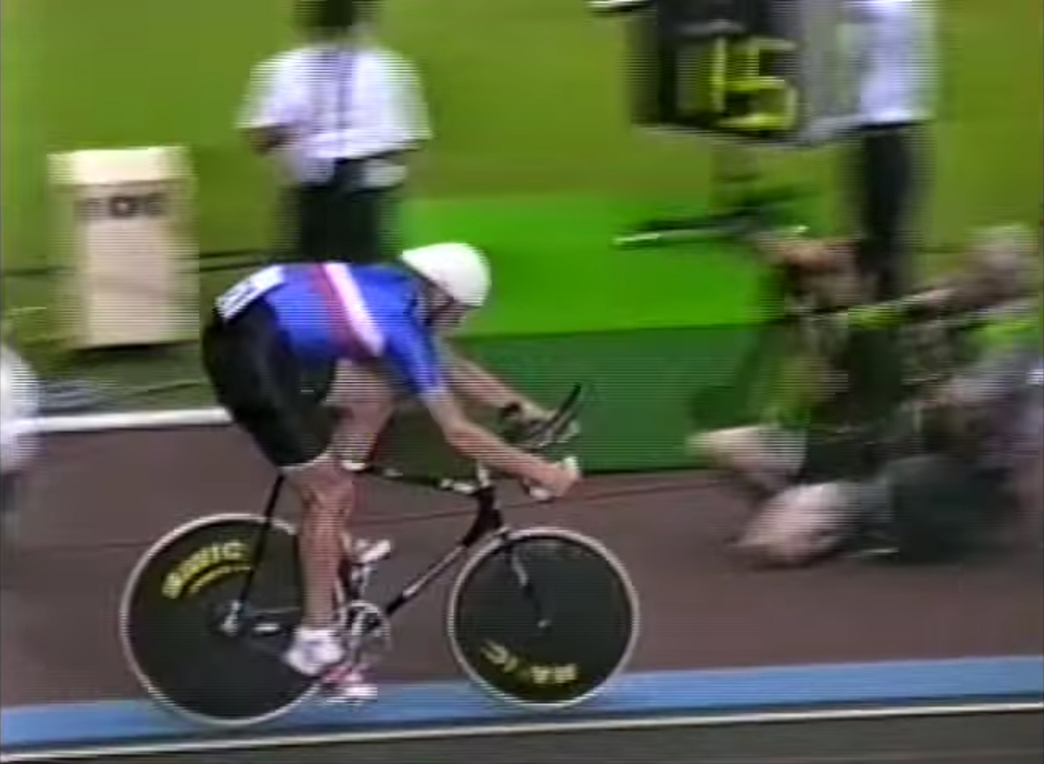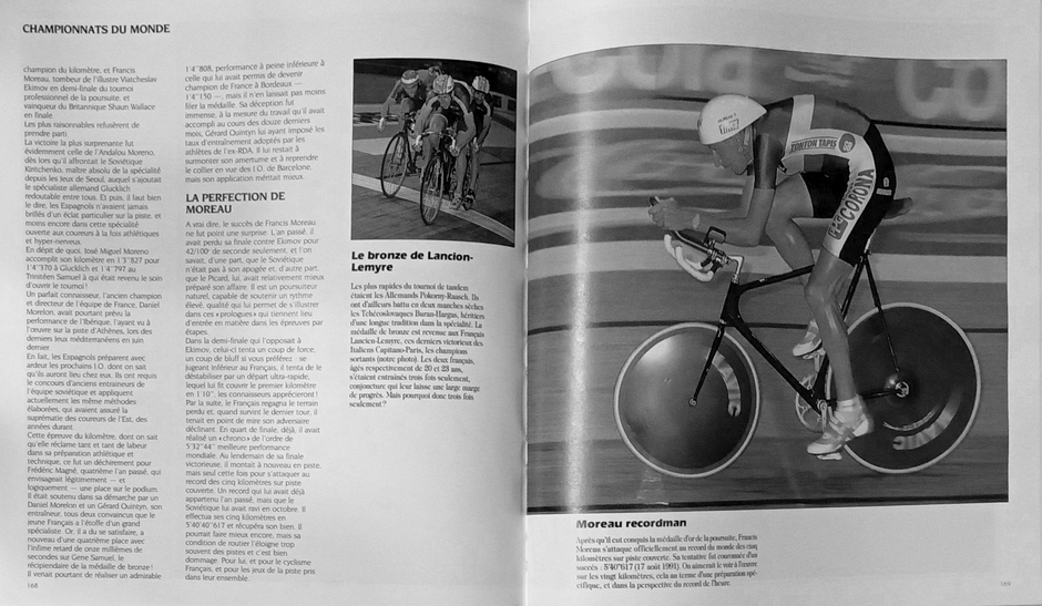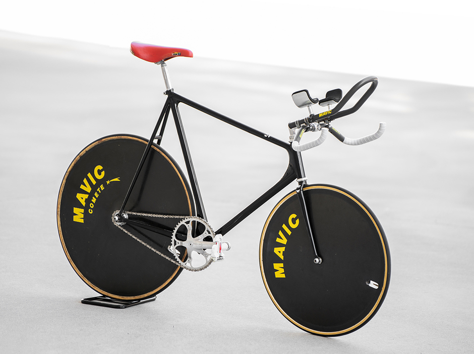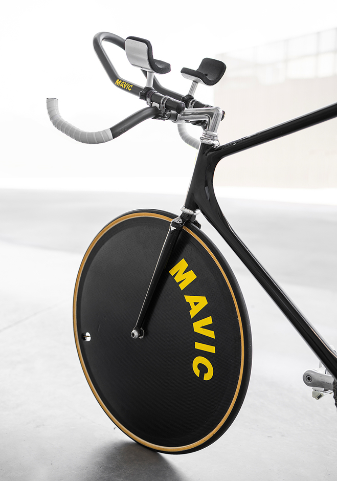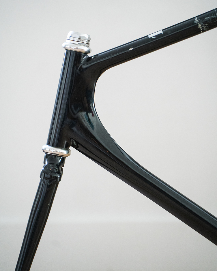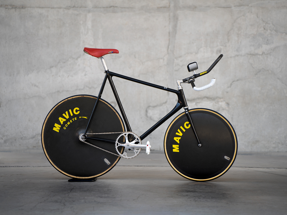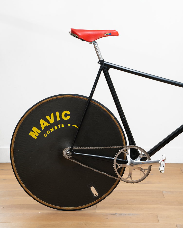 Cinelli laser in columbus MS 600c French team used by Francis Moreau, World record and gold medal 1991 1 of the 5 , 24" pista laser ever made. And the only one who won gold medal. Close build of the 1991 worldcup in frankfurt of this rare columbus Multi shaped cinelli laser. Very 90's setup, unusual color and stuffs on this crazy geometry laser. The front 600c wheel and the big size of the frame made a crazy slop. Build half Campa and half Mavic parts, it has its italian blood with a bit of french touch. 1988 Olympic games 4th place 1989 worldcup Lyon 1990 silver medal japan 1991 gold medal and World record frankfurt Why black frame ? originaly painted in dark blue in 1988 and 1989, then repainted in black with " team kg 96 replica " stickers in 1990 ( sponsorship) , and stickers finally removed in 1991 to let only appears the black paint with no brand or sponsor.