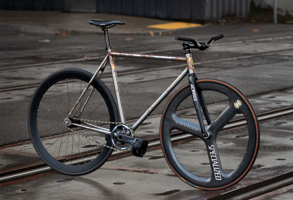 Walton's old Mash Work prototype frame. Crimped on the inside of the chainstays instead of the outside as on production frames.