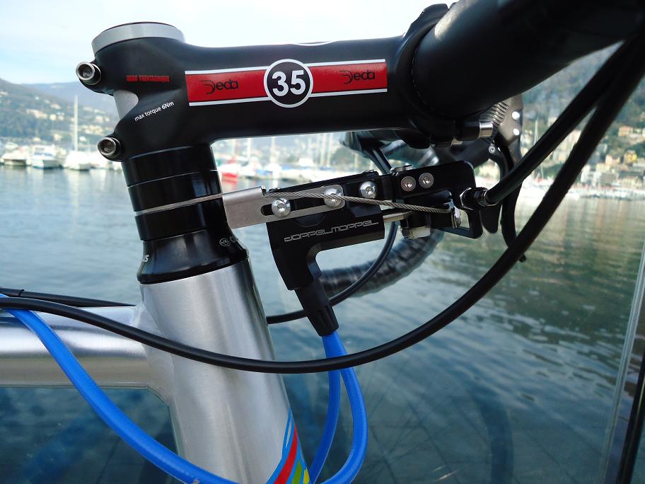 Finally I assembled a road bike with hydraulic disc brakes: Doppelmoppel master cylinder from Trickstuff coupled with Formula Oro 24K calipers. I also mixed a Shimano 10s cassette with a Campagnolo 9s rear mech and Campy 10s Ergopower. I can't believe everything works fine!