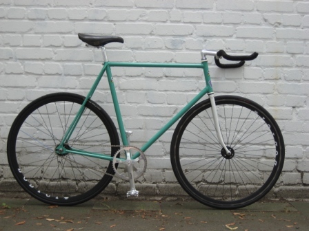 I bought this 4 years ago and built it up for daily "street" (ab)use... it is a superstiff ride, and I had a lot of fun with it. the last picture is of the bike in its original color. it was ridden by a belgian track bike rider whose name I forgot. unfortunately it was repainted, but the original paint job was not pretty anyway...