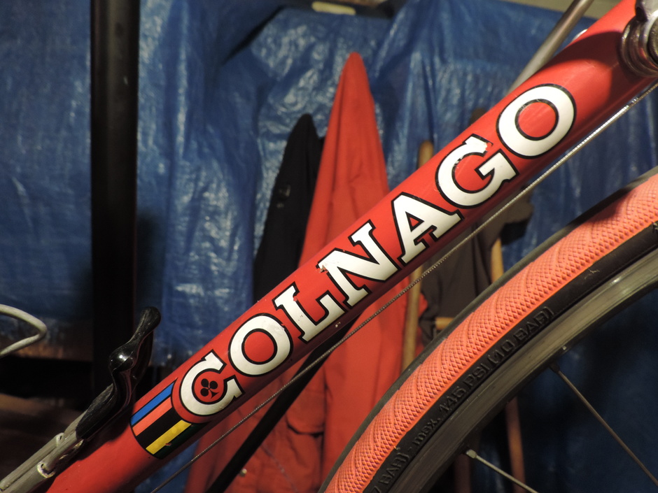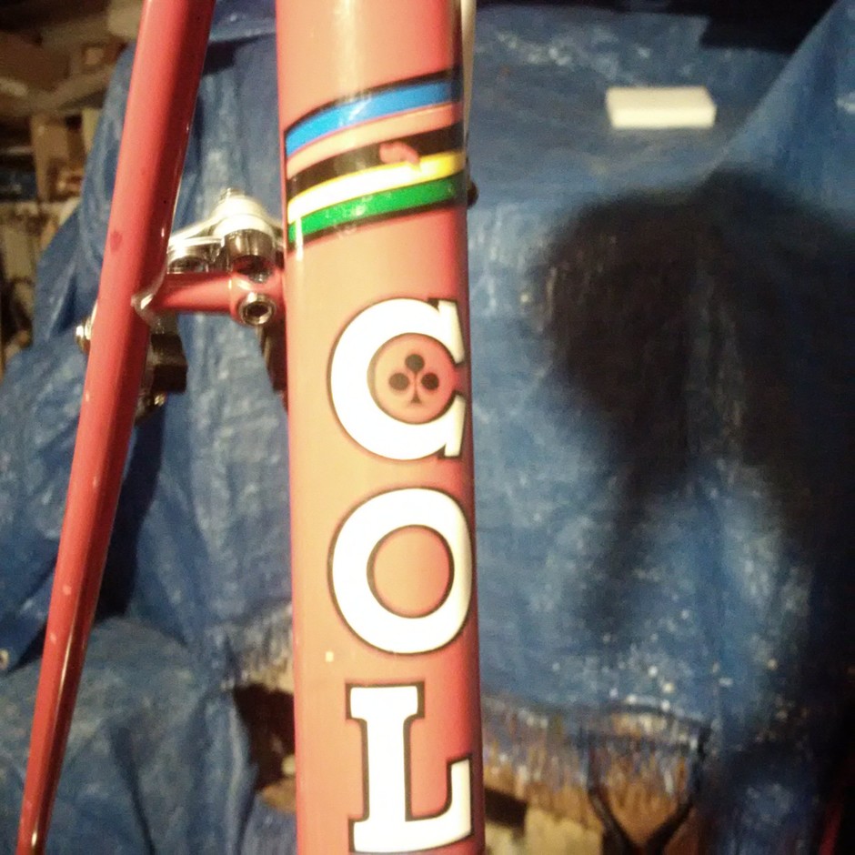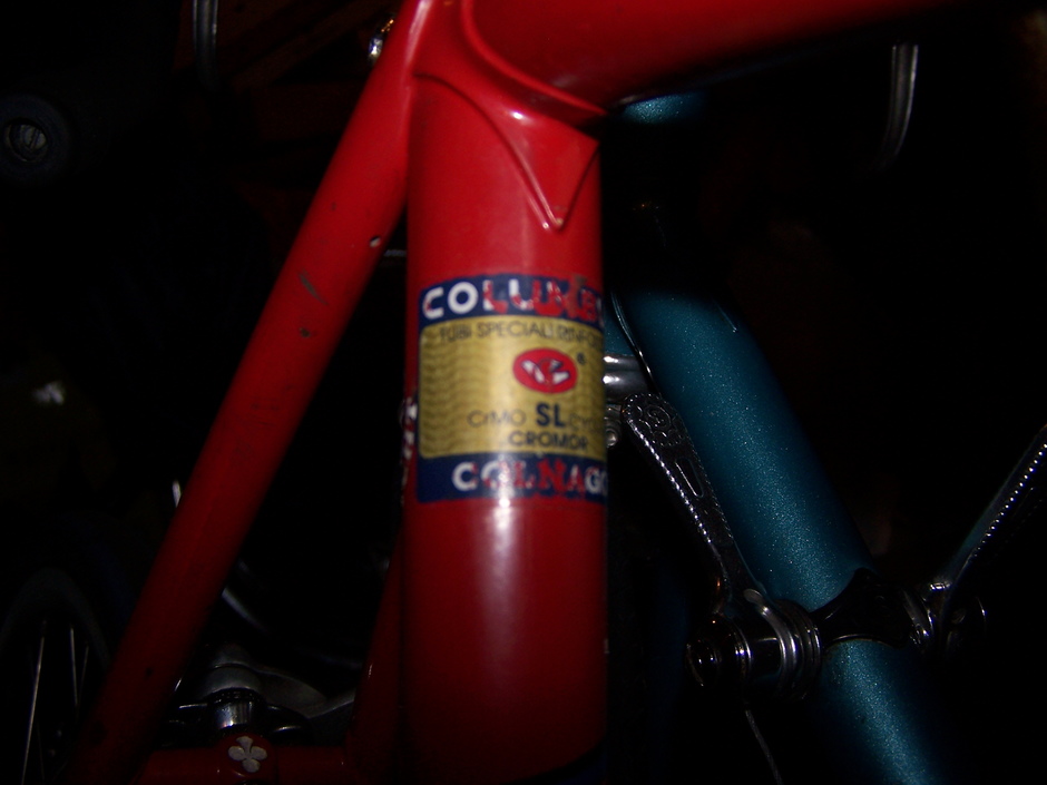 My bicycle frame is an early COLUMBUS "SL" + "CROMOR" COLNAGO "Super Sprint" model (NO frame stamp "SPRINT" on the BB as that appeared one year later in 1988) but is VERY similar in construction details to the Brown bicycle with the name 'BEUKERS' on the T/T and identified on this site as a COLNAGO "Super Superissimo". Both bikes have the same COLNAGO Seat tube and Down Tube decal set with the COLNAGO "Ace Of Clubs" located in the center of the "C" of the name COLNAGO, Chrome Head Tube lugs, NO 'Colnago' embossed stays, both have COLNAGO frame & front fork ends, both have two BIDON cage bosses, both have the Rear brake cable routed through the T/T(easily confirmed available prior to 1987 by COLNAGO catalogs from 1982/1983 and was even on the COLNAGO bikes for the 1980 MOSCOW Olympic Team!).