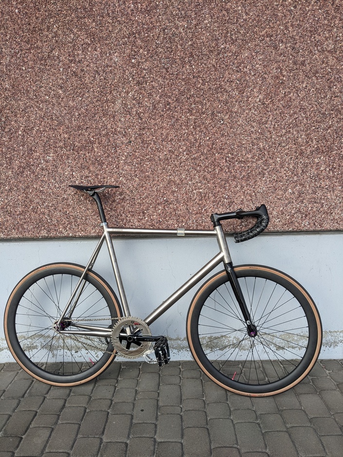I liked A-Frame track frameset very much. To be honest for such a beauty with nice fork, white industries headset and great finish for asking price it's a great deal. I would definitely go for it if Xl size was right for me. So I contacted Waltly to make it in my sizing. Ett - 613 mm, st - 620 mm, ht - 195 mm, 75° angles. I'm 198 sm (6'6) and with 130 mm stem this bike feels just great. No toe overlap. Wheelbase with 53/17 ratio is 1010 mm. So far only positive emotions...
