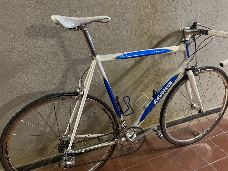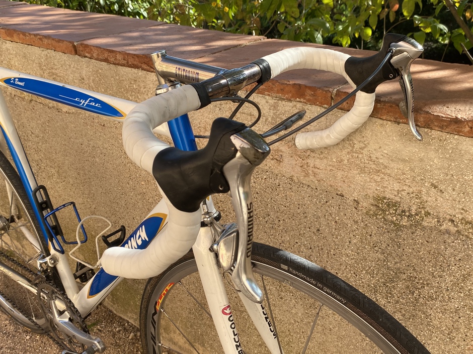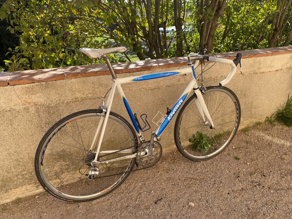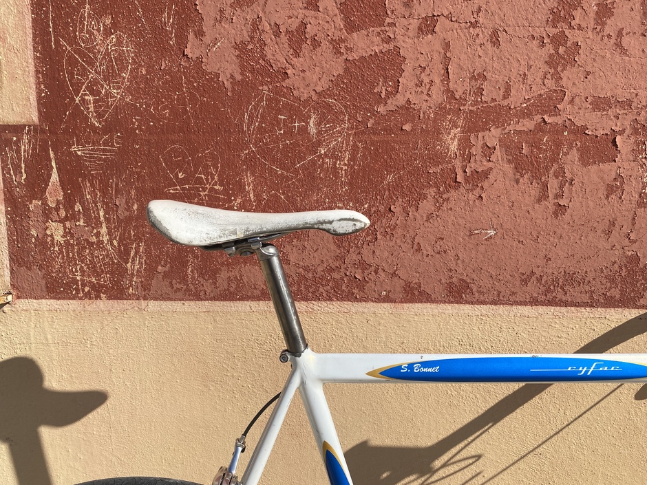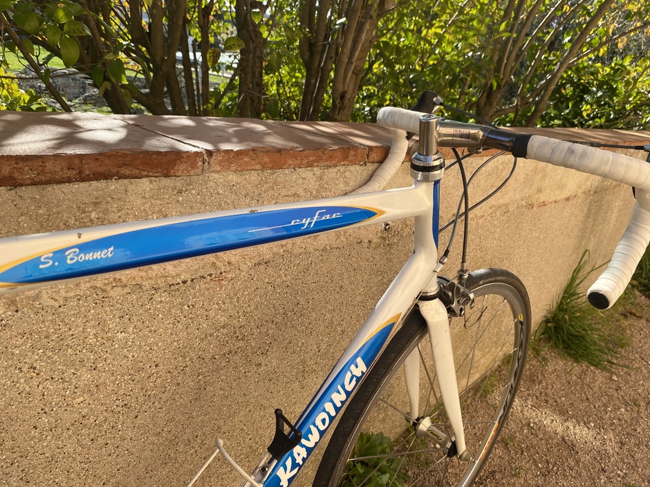 Bargain deal for this lightweight steel frame thanks to a stuck seatpost. Hope it rides ! The groupset missed a few parts but I managed to gather what it needed. Campy seatpost just because ! Kawoinch was a mechanic from the Tour de France. He sold some Cyfac frames to the local sportsmen ! Mine has "S. Bonnet" name on it, custom made for the pro rider William Bonnet's brother : Sebastien.
