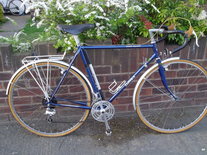 Also converted to 700c wheels Shimano Tiagra hubs on Mavic rims (from Dave Hinde), with Schwalbe Marathon tyres and a cargo trailer comes in useful for shopping or taking a decent amount of camping kit on tour.