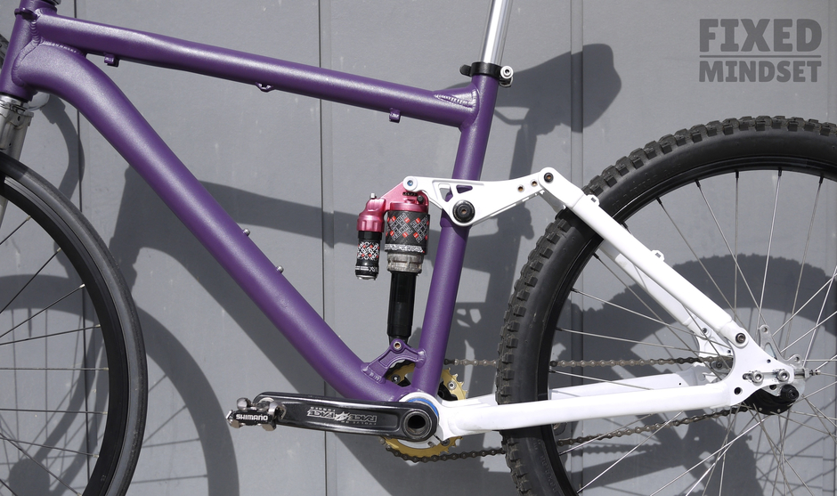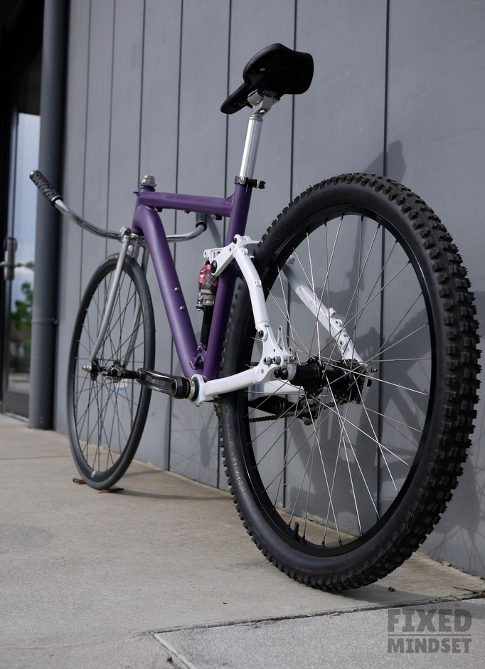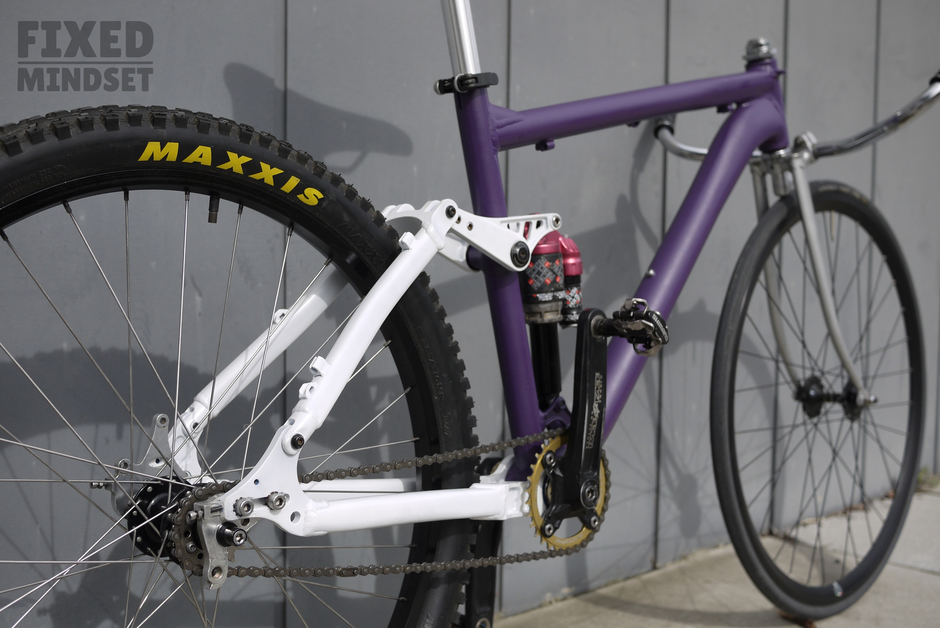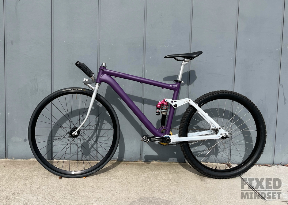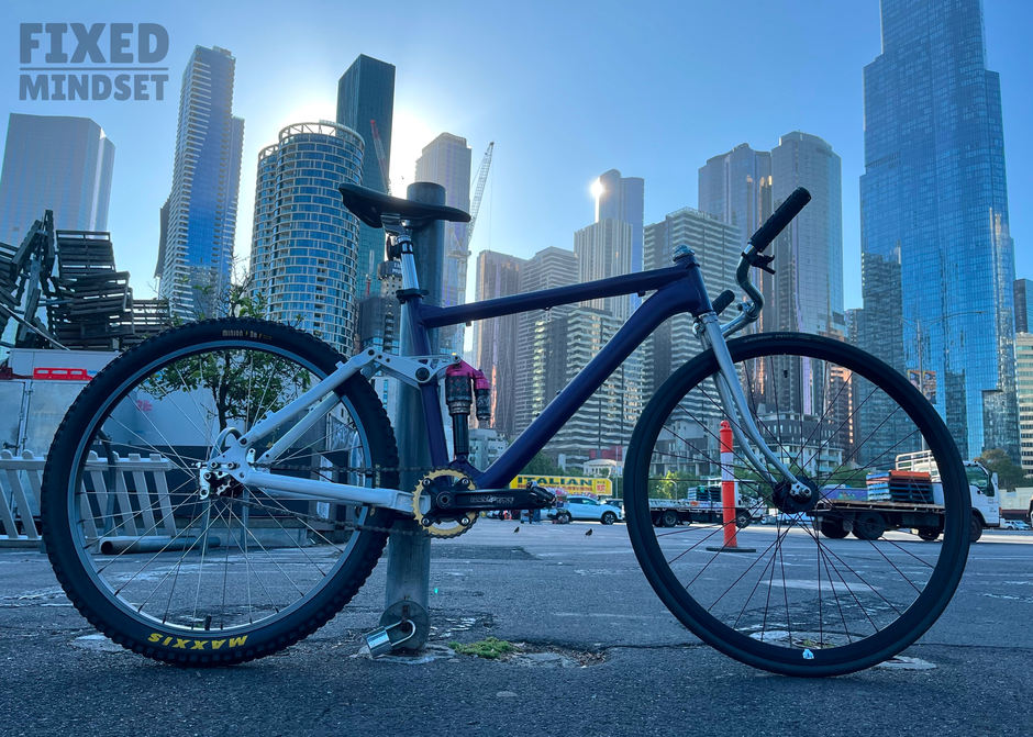 I've been wanting to build a full suspension fixed gear for a while. I also love the look of the USSR Takhion pursuit bikes, so had this crazy idea of mashing up a full suspension MTB frame with a track style front: a threaded fork plus an upside down quill stem. The rig rides surprisingly civilised considering the radical setup. It's been called an "abomination", which I take as a compliment Enjoy #fixedmindset #madeinmelbourne