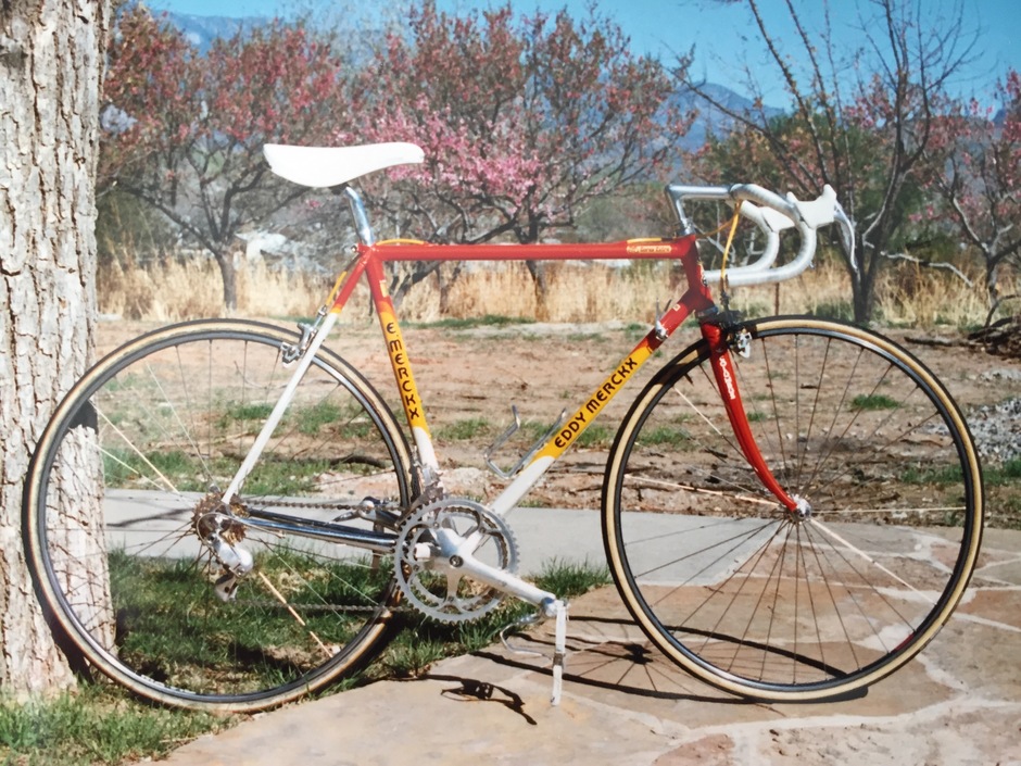 Eddy Merckx Corsa Extra 54 cm Team Hitachi, Columbus SLX tubing with full Campagnolo C-Record Cobalto with Syncro shifters. 1991 if I recall correctly. Selle Italia Turbo saddle, Cinelli 1R Stem and mod 66-42 bars. Look Carbo Pro pedals, Campy Strada Hardox rims