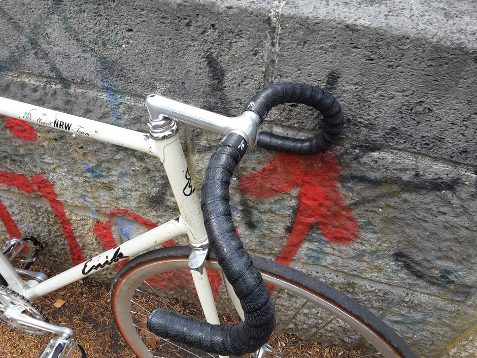 Enik frames were made in North Rhine-Westphalia(NRW) by Emil Niklas, the range included everything from low-end to custom-made. Enik sponsored the NRW amateur team and junior riders with custom made frames as seen here. This frame is made out of Columbus SL and SP tubing and Campagnolo dropouts. For sizes smaller than 58, only SL tubing was used, but for the bigger frames, SL just isn't stiff enough, so they made a mix with the SP tubing, thus creating a 27.0 mm seat post diameter. The fork steerer is a bit short, so that's why the Campy Gran Sport headset is installed, it stacks very low. No serial number on the BB shell