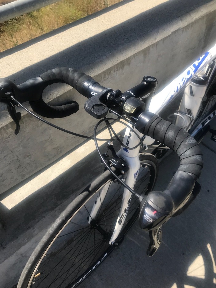 2018 update: Custom 3d printed garmen mount with a KOM garmin holder, new NOT WHITE cinelli cork grip. and a Transit saddle bag. No name brand Look style pedals and Shimano R800 shoes with red look cleats.