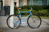 Chrome lugs, chrome fork and beautiful sky blue tubes on this F5 Pista custom built for Goldstein. Great set of components including our limited edition anodized blue lattice chainring, Nitto stem, Gran Compe low flange hubs, H Plus Son rims and BROOKS finishings.