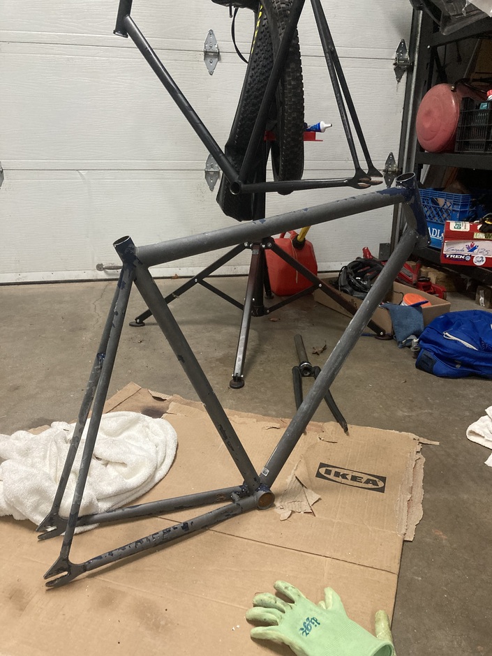 A good friend of mine found this frame laying beside a dumpster. It was too big for them so I bought him a few beers and took the frame home with me. Stripped the frame and trashed the heavy, ugly, massive fork it had. Was planning on building a beater that I could ride and leave out and not care too much about, but I had some nice parts sitting in the basement that I was initially going to sell off.... but here we are lol. Always wanted one of these frames since I sold my kilo tt that was too big for me.