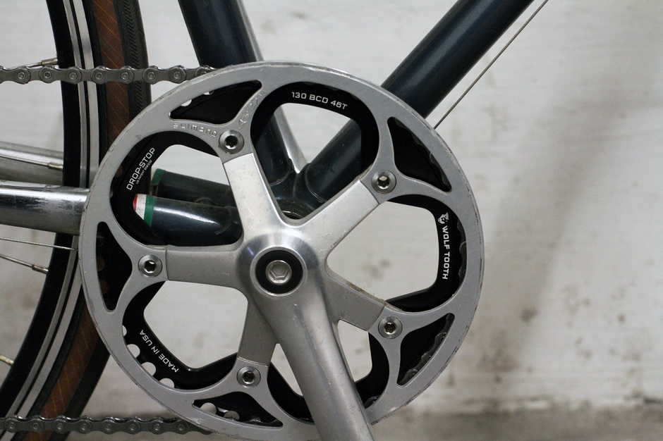 1x10 speed / 46 teeth Wolf tooth (130 BCD, Drop-Stop A) with chain guard (Shimano 105 52 teeth without teeth) / KMC chain (DXC CN/TEN).