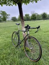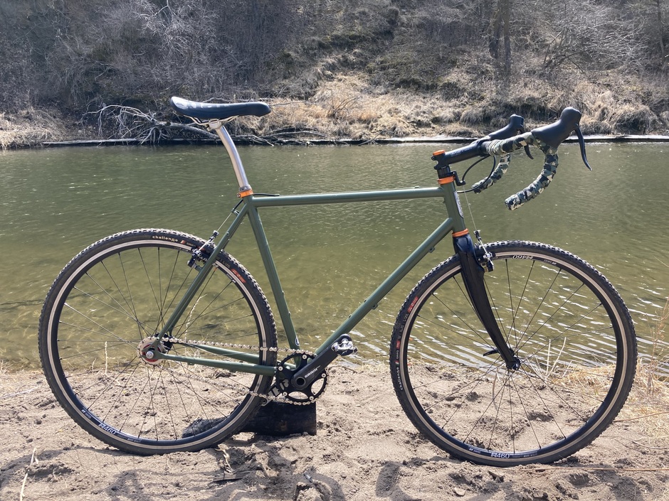 Coaster brake tab has been ground off. I'll grind off all the other braze-ons someday. Gonna detail the dropout windows with hi-viz paint soon. Three sets of wheels. 19.2 lbs as shown.