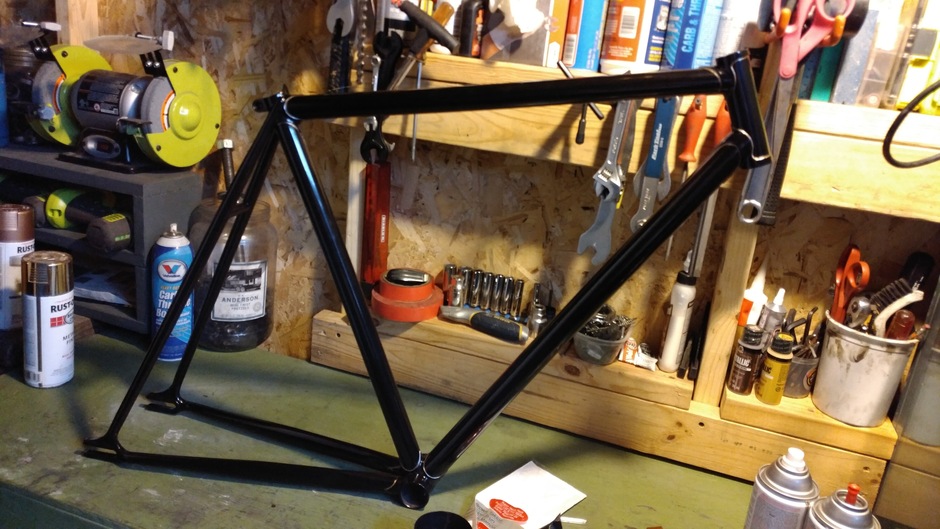 I purchased the frame and original fork on craigslist in Austin TX for pretty cheap. The frame was in rough shape, no paint, rust, dents and dings on the chain stays and top tube. I sanded the frame down, filled dents and dings with metal filler, painted the frame with Krylon Dual paint and primer then pin striped the lugs. Going to finish the fork soon after I take it to the Yellow Bike Project and thread it.