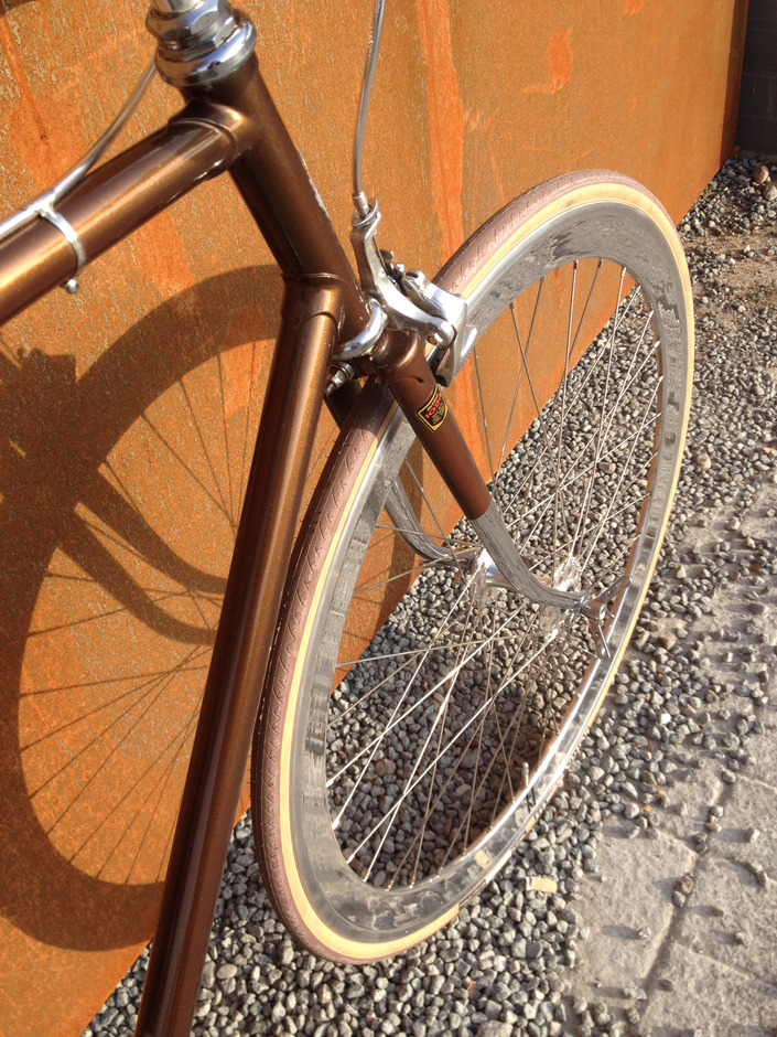Poor conditioned Road Bike that has been paint stripped, repaineted in Chestnut Metallic Brown and build up as a Singlespeed Commuter.