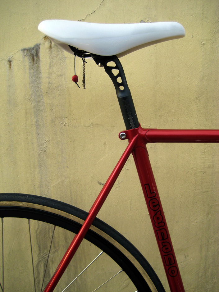 this was an old road frame that i had "converted" into a track frame. with the help of our local frame builder, Ave Maldea, we were able to adjust the geometry to a more aggressive configuration. we also changed the seat lug from stamped to an investment cast one. the bottom bracket has also been replaced with an english threaded one. finally, we replaced the horizontal dropouts with stainless steel track ends.